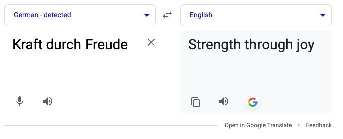 The phrase is an English translation of "Kraft durch Freude", a slogan used by Nazi Germany for a state-run leisure organization designed to promote well-being and productivity among German workers.